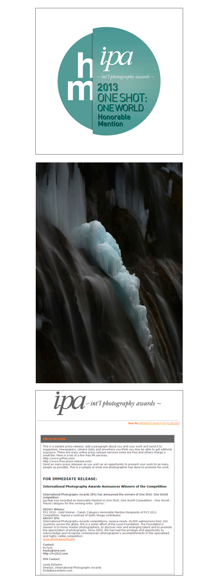 于2014年4月,不经意的查询,收到来自美国IPA国际摄影奖 获奖通知: