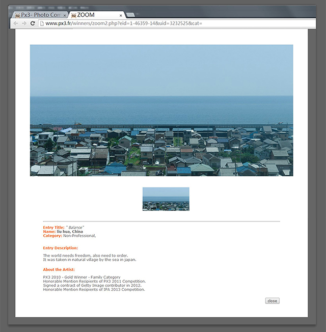 7月初,法国PX3国际摄影奖2014年度竟争--颁奖发布。昨日查阅官网,收到获奖证书一枚,截图与朋友们分享!-----国际影赛的参与,获益更多的是眼界与理念的拓宽;面对85个国家数千人参赛的交流平台,既是交流也是自考。